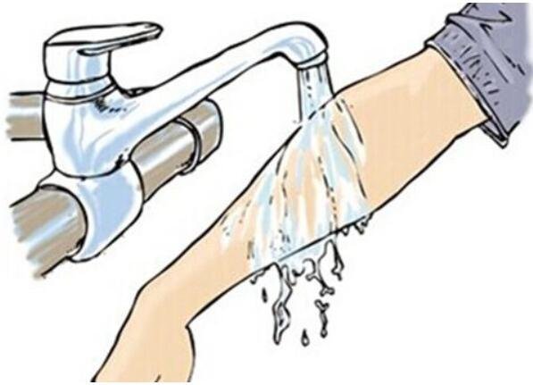应迅速除去被污染衣服,及时用大量清水冲洗或用合适的溶剂、溶液洗涤受伤面。保持创伤面的洁净,以待医务人 员治疗。若溅入眼内,应立即用细水冲洗;如果只溅入单侧眼睛,冲洗时水流应避免流经未受伤的部位。